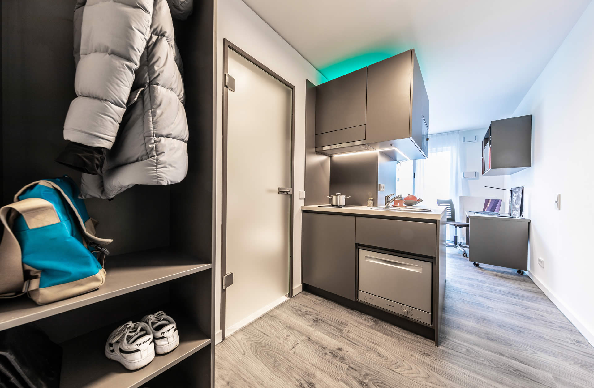 Du parkst dein Fahrrad oder dein Auto direkt in der hauseigenen Garage, schnappst Dir deine Post im Foyer, triffst Dich mit Nachbarn auf einen Plausch, zum Kickern oder arbeiten im Gemeinschaftsbereich und zauberst Dir ein tolles Essen in der Kochnische, bevor du es Dir vorm Smart TV auf dem Boxspringbett gemütlich machst.